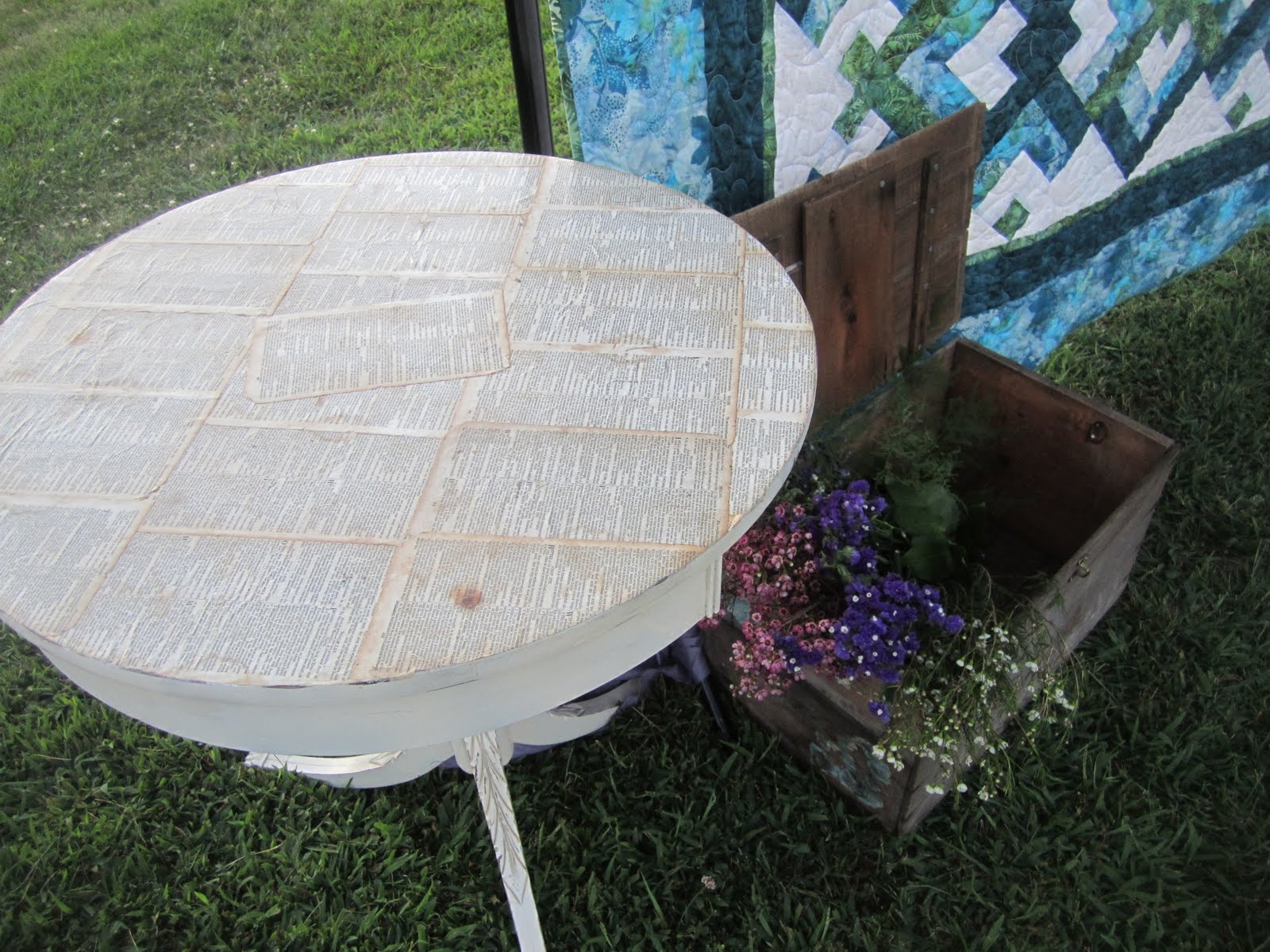 | Another of my decoupaged tables and an antique wood crate. The grandmother of the bride made the gorgeous quilt for the couple. |