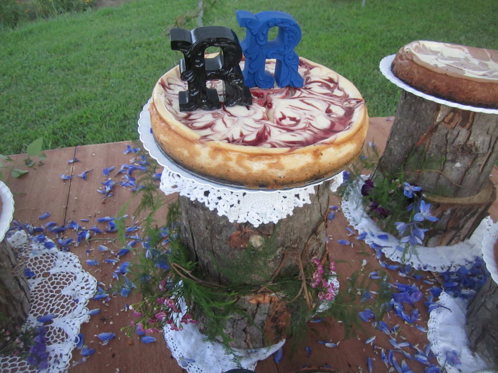 | The couples initials on their cheesecake. A few weeks ago I got a huge bag of vintage linens at an auction and they came in very handy for this wedding. |