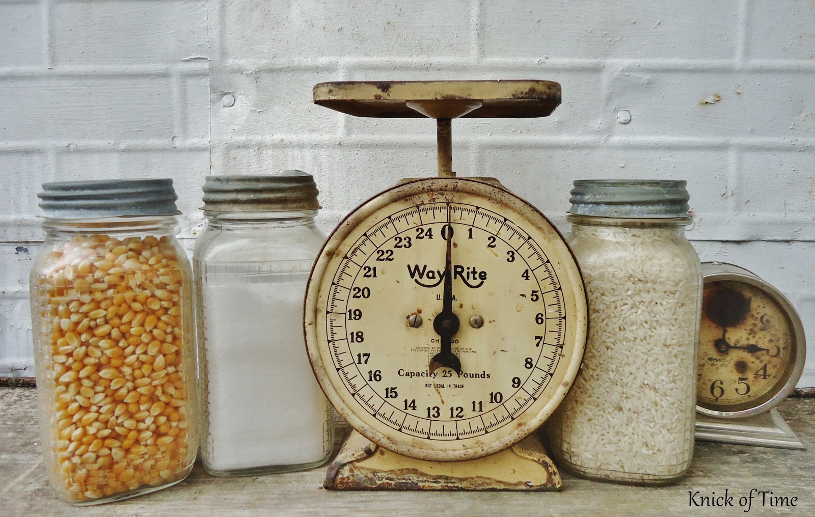 oh! I put my dry goods in them too. One each for sugar– brown and white; One for flax seed, things like that. I have an old Atlas jar…it is full of musket shots, that we collected around our barn. It makes a wonderful book end, nice and heavy.