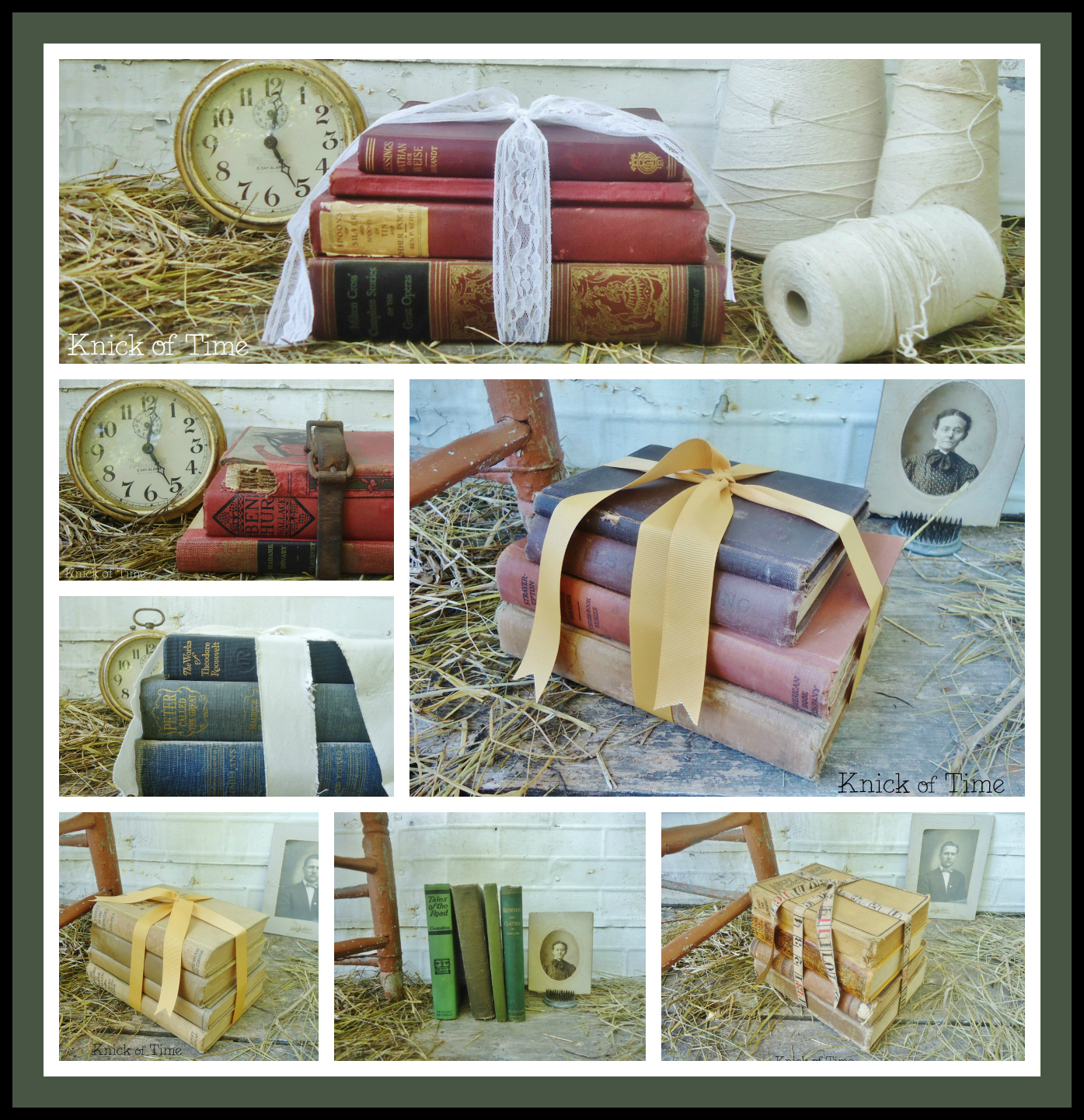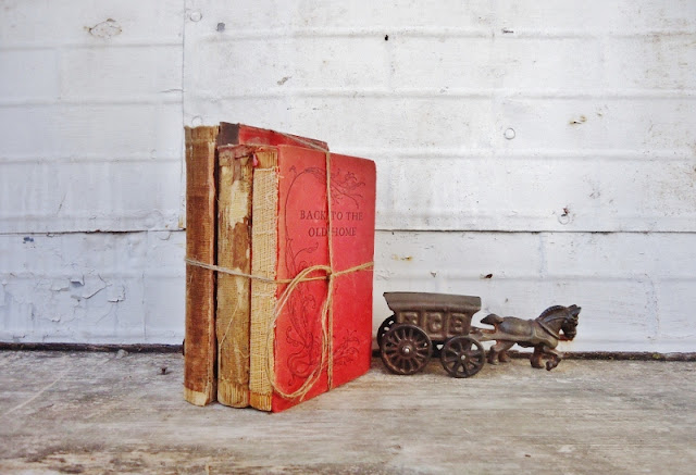 I love your vintage book displays. I adore old schoolbooks. I recently bought a few old books at the swap meet, and have yet to put them anywhere. I like your idea of tying them together and displaying them. Thanks for inspiring me! I enjoy reading your blog as you always have such great vintage finds. Have a great weekend.