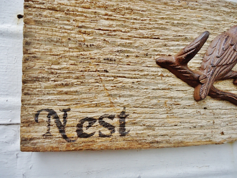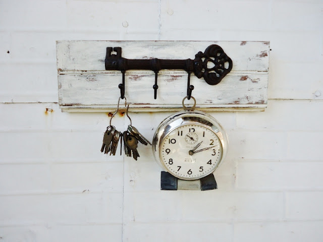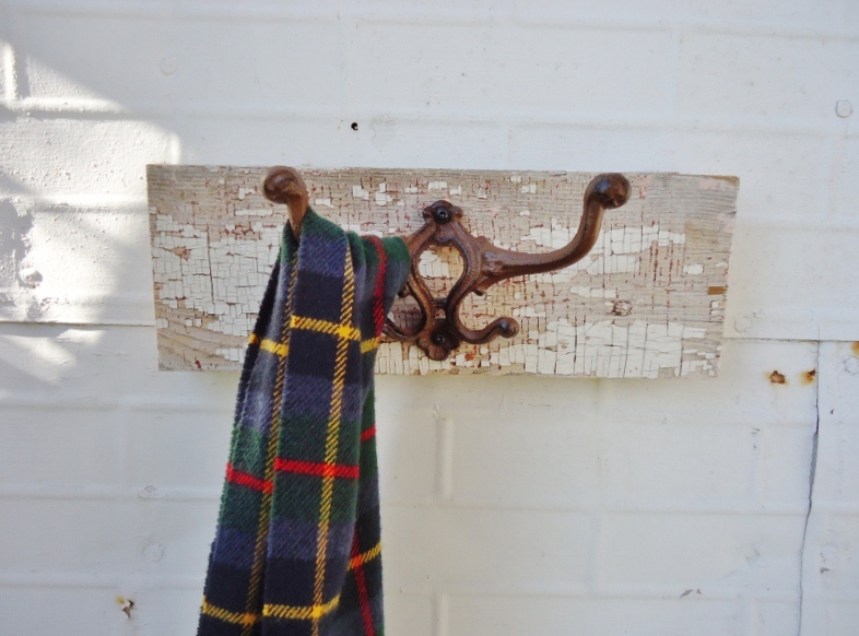 Some chippy door salvage got a coat hook added to it.