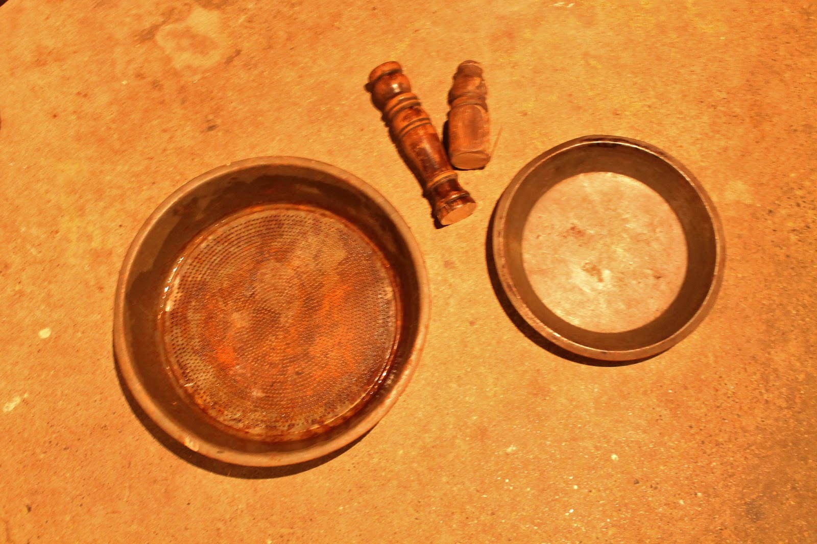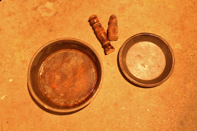 Sorry for the lousy, nighttime photos, but I used some kind of old sifting pan, and an old pie tin, and where do you think that spindle came from?