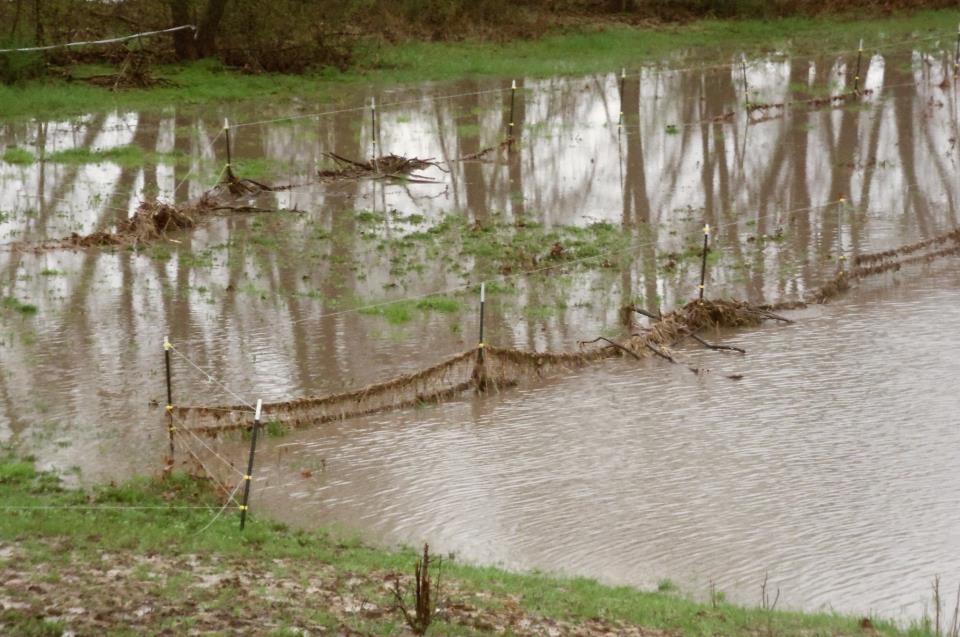 You can tell the water was even higher before we woke up, because of the debris hanging on the higher wires of the electric fence. The water receded amazingly fast though, and within an hour had mostly drained back out, leaving a little sandbar behind from creek sediment.