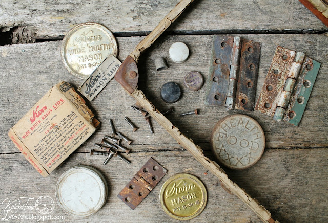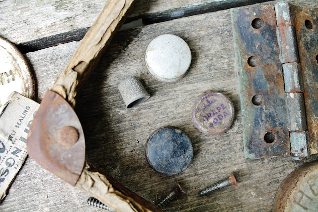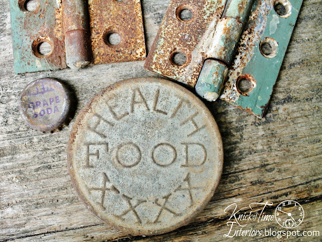 He also found some wonderful rusty painted hinges, a Nehi Grape soda cap and Health Food lid. I’ve gotta think of something wonderful to do with that Health Food lid – I love it!
