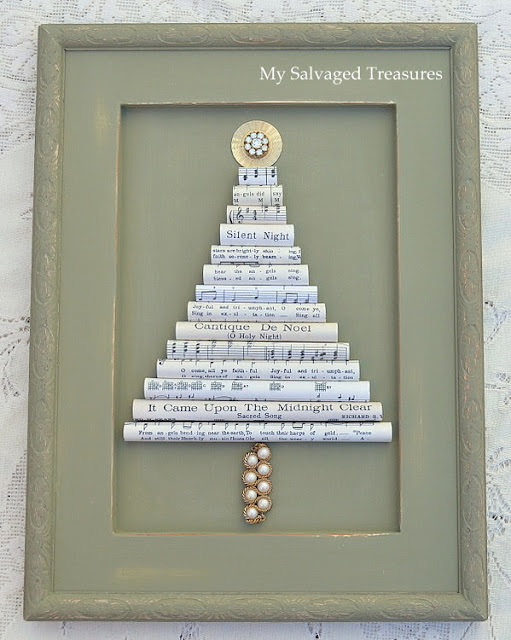 Betsy @ My Salvaged Treasures created this adorable Christmas tree using Christmas sheet music, a frame and some jewelry bits and pieces.  SO CUTE!!!