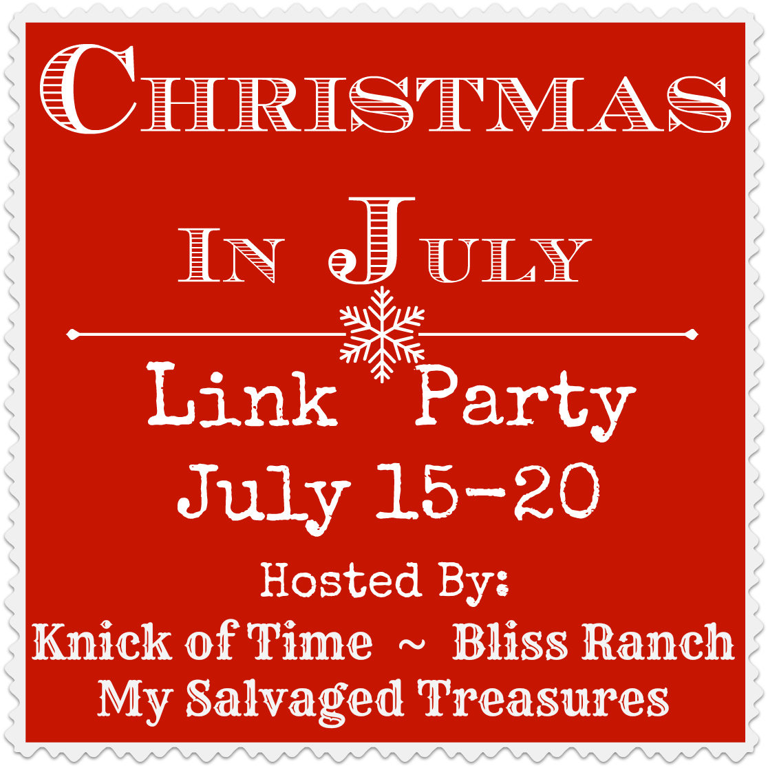 I hope you are gearing up for some fun on Monday, when the Christmas in July party gets started. Be sure to visit my co-hosts at My Salvaged Treasures and Bliss Ranch to see what they have created for the party.