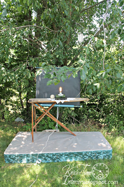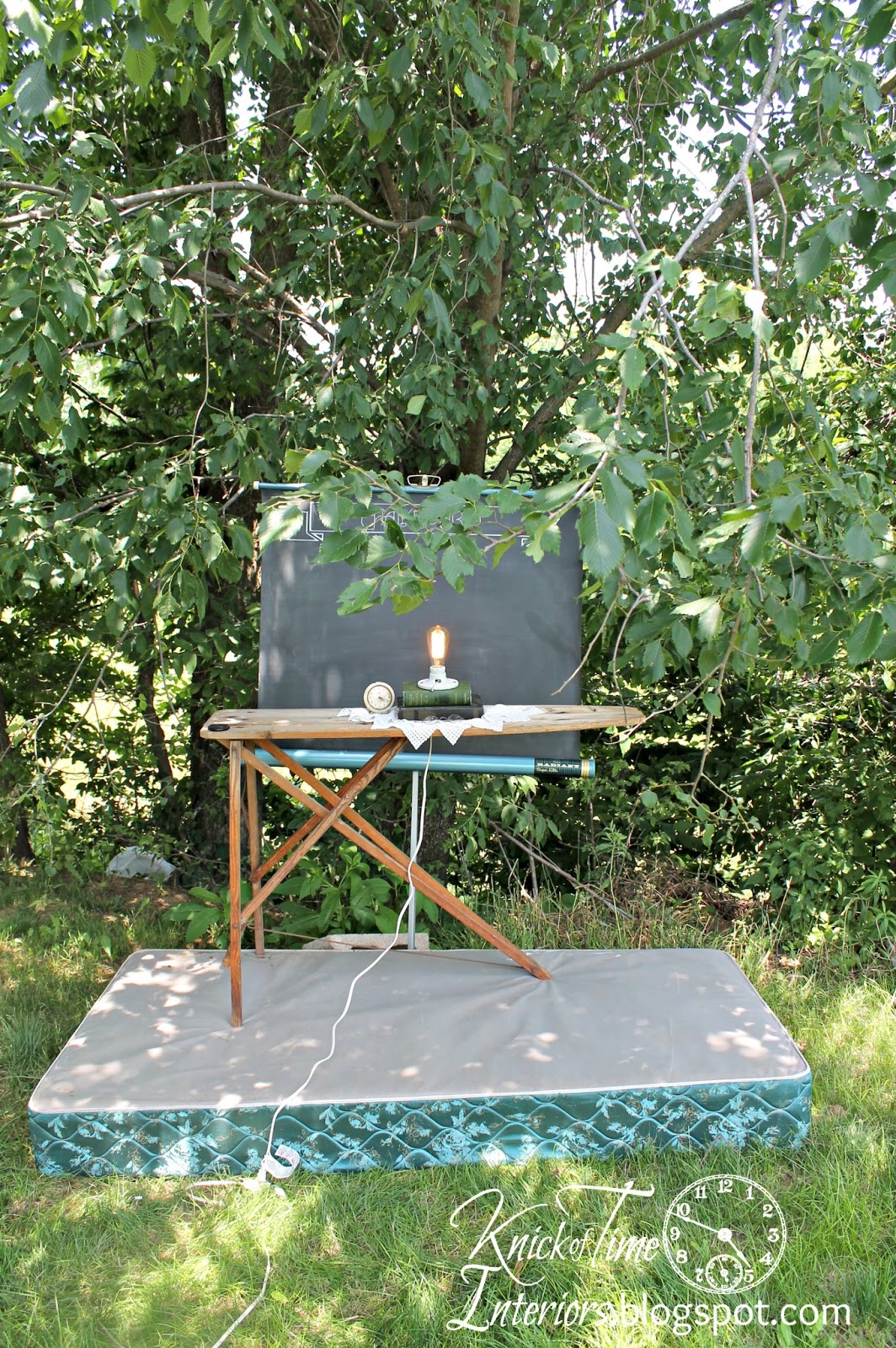 The more I thought about it, the more I *had* to have a chalkboard backdrop, so what should have been a 2 minute photo shoot, turned into a 20 minute one. I remembered I do have a movie screen that I had painted with chalkboard paint, so I set it up in a shaded area, with a cinder block weighing it down to keep it from blowing over. Then I needed something to use as a table. An old ironing board did the trick, but it wasn’t tall enough that the blue bottom of the screen wouldn’t show. My husband grabbed a box spring destined for our burn pile and used it to add some height to the ironing board. Viola! My fancy photography studio!