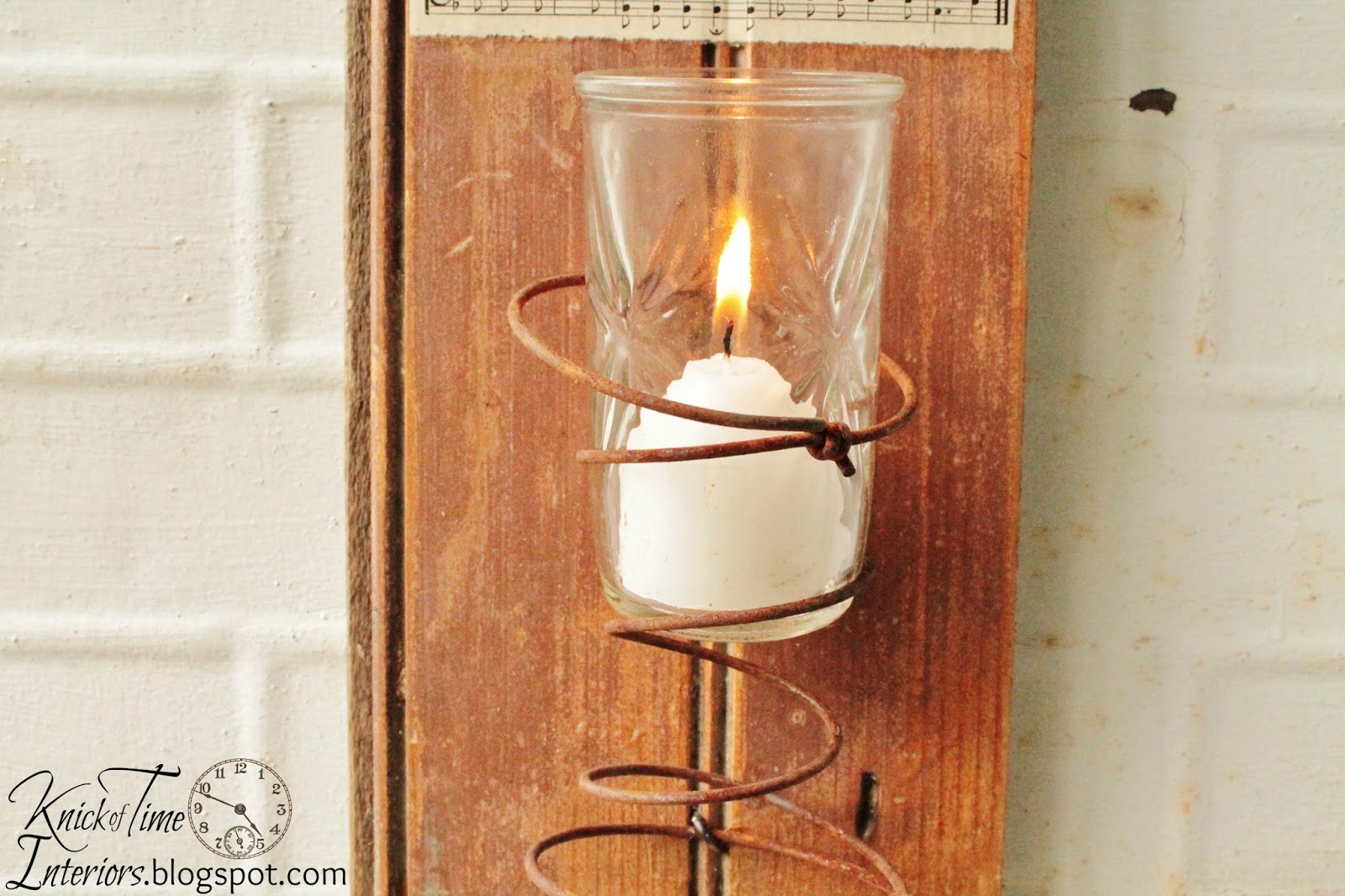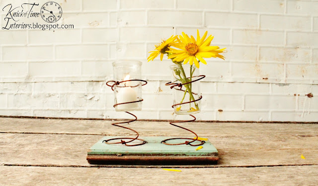 A few rusty springs with jelly jars in them were added to a salvaged piece of tongue and groove wood. It makes a fun little candle or flower holder.