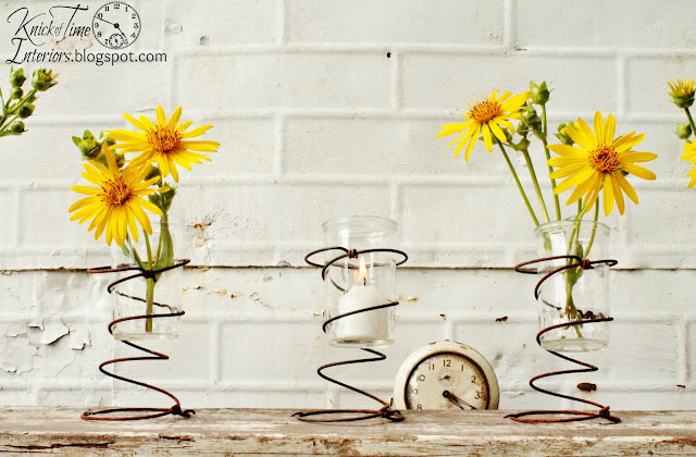 I clipped a section of rusty springs from an old mattress to use as another type of candle or flower holder, but since the springs are metal, it could also be used as an unusual magnet board or clip board with clothespins.  I love the quirkiness of it.