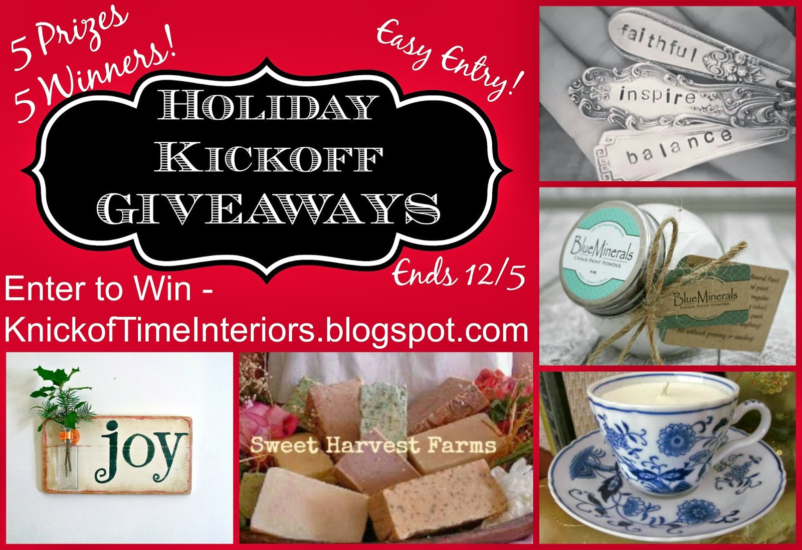There are 5 separate giveaways and each will have 1 winner, so enter as many of them as you wish. The giveaways end on Dec. 5th. Come back on Dec. 6th and I’ll announce the 5 winners. Winners will have 24 hours to claim their prize.