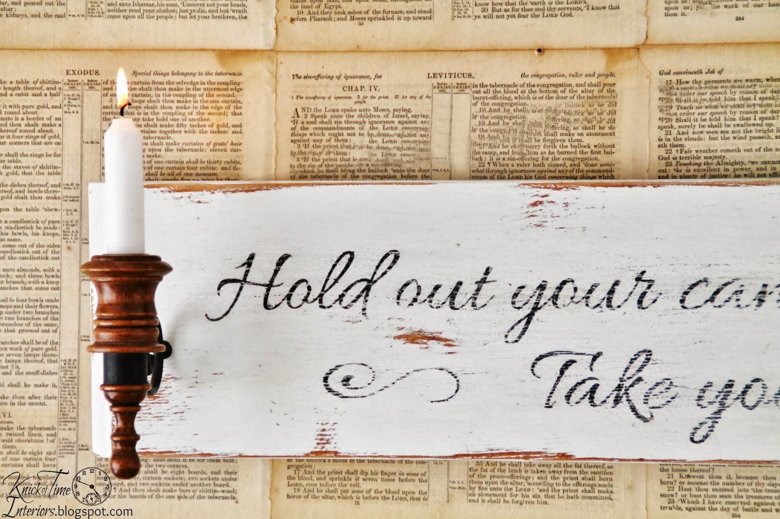 I distressed it, waxed it, and attached a candle holder from a wall sconce on one side. I think the candle holder really adds a great visual to the message on the sign. It’s available in my shop HERE.