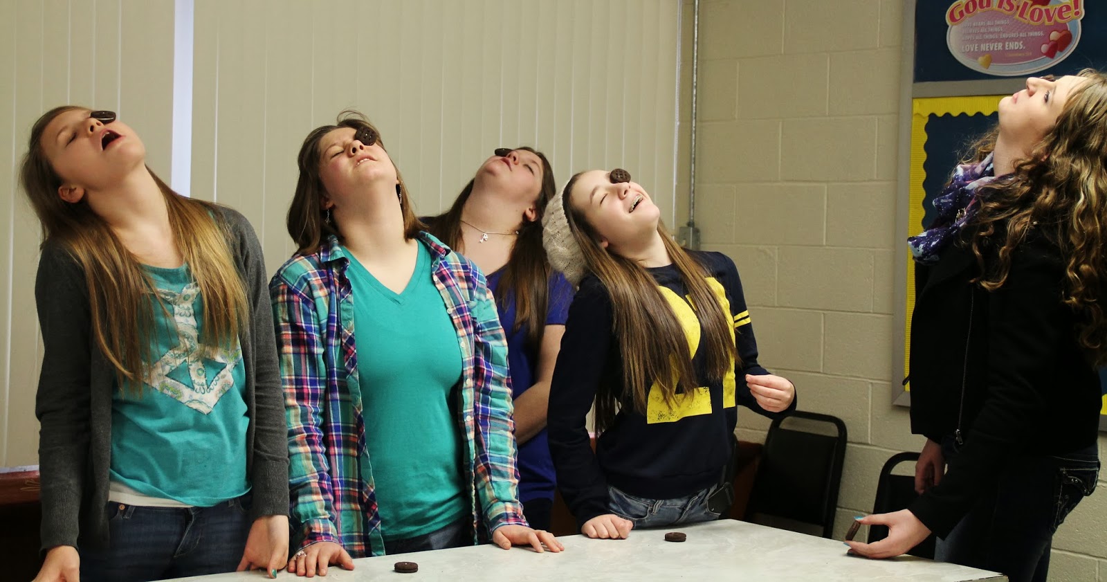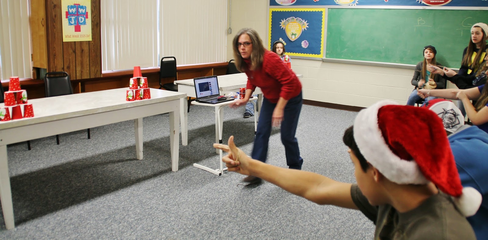 I searched YouTube for games to play and got hooked watching them all. There are even video clips with a minute countdown timer you can use for your own games, which is why my computer is sitting between the 2 tables. There are oodles of great game ideas out there and my group had a lot of fun playing them. I’m attempting to dodge the rubber bands the kids are shooting at a stack of cups here.