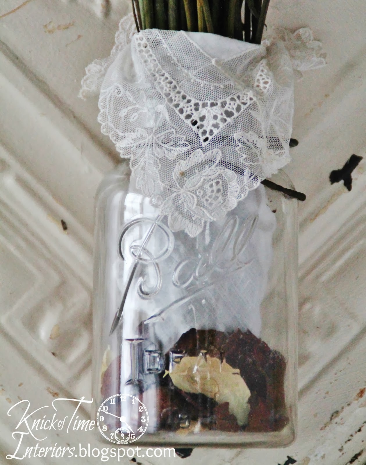 Since I don’t need any water in the jar for the flowers, I just dropped some of the dried petals into the jar and wrapped a vintage lace hanky around the stems. You could also paint the outside of your canning jar, then the stems wouldn’t show at all.