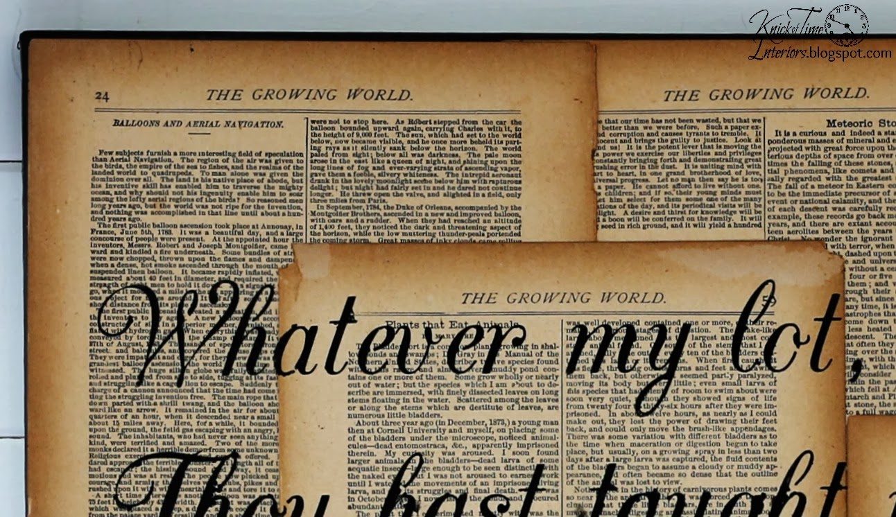 I paint the edges of my canvas first, then decoupage the book pages in layers onto it. I use a mixture of glue with a little water to decoupage. These particular book pages are from the early 1900’s and are brittle, but as long as I’m careful, they work well for projects like this.
