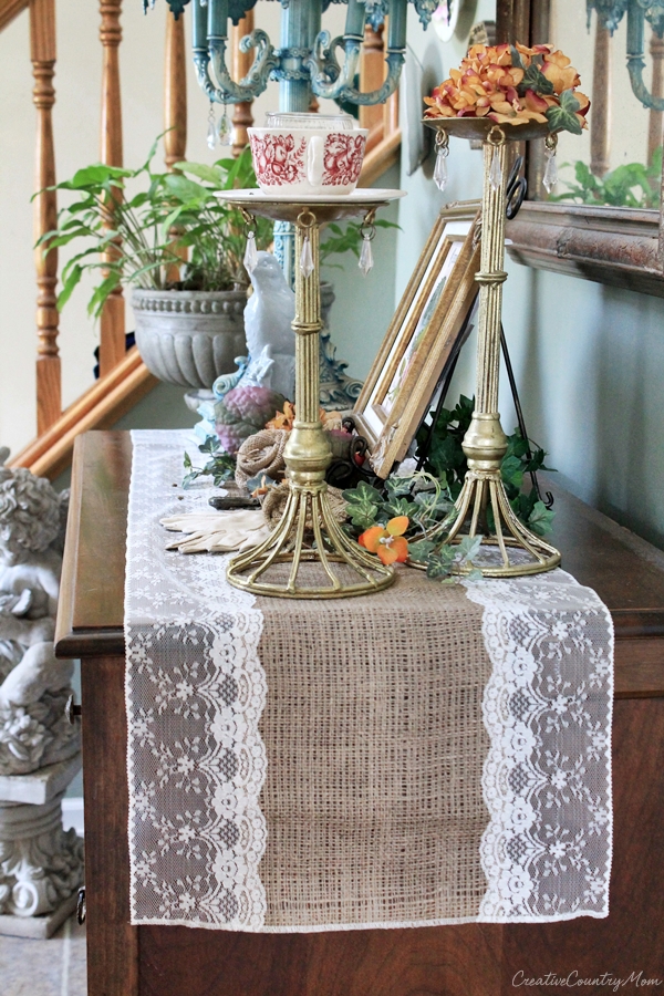 Creative Country Mom shared this beautiful burlap and lace table runner. I love the combination of rustic and elegant.
