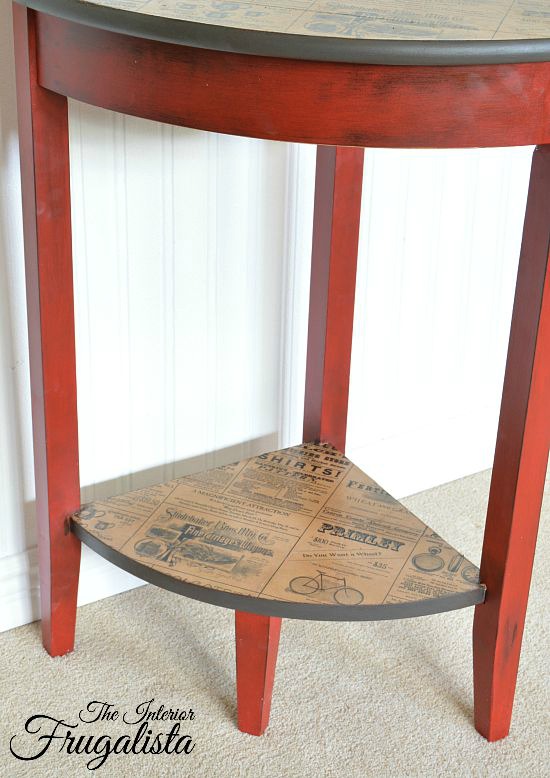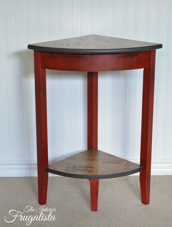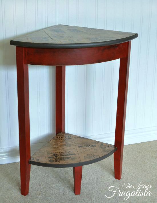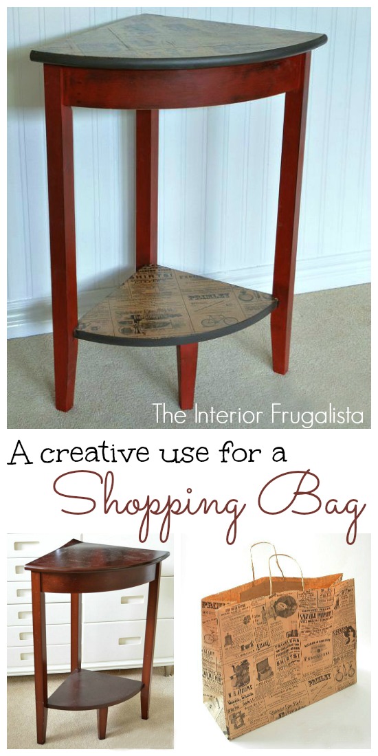 My neighbor a.k.a. The Furniture Fairy gave me this cute little corner table. I forgot I had it until rummaging through the shed one day. That same day I was going through my scrapbook paper bin and came upon a shopping bag that I had saved. I don’t remember where I got the bag from but obviously loved it enough that I thought it might come in handy some day.