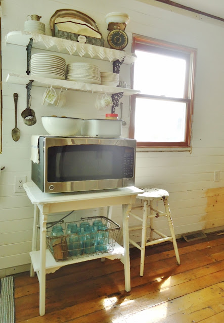 Your kitchen is really coming together. I love that sweet galvanized tote, and it really is perfect for your dishes. The table is perfect for your microwave.