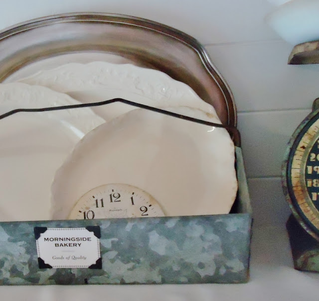 Angie, it’s all coming together so wonderfully. Love the tin tote. It looks so cute with your ironstone and the fun label. Don’t you just love Magic Eraser? It’s one product that really lives up to what it says it will do. I have a shopping basket like that. Right now it’s in my kitchen window with an old scale and some plants. I have alot of blue jars, may have to switch it out sometime. I love how it looks.