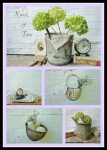 I love baskets of all types – wicker baskets, wooden baskets, metal baskets, but I love turning things into baskets that didn’t start out that way. I brought home several new “baskets” from the flea market recently, so they have become my latest “theme”. For example, this “basket” was originally used by fishermen, the wire and patina make it perfect to bring in from the lake to the house. Do you know what this is? It was a horse muzzle, {Read More}