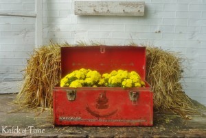 I bought this old metal toolbox at the auction months ago and usually sell them, but I didn’t realize this one was missing part of the latch on one side, so I decided to keep it and plant some fall mums inside. It wasn’t until I had the flowers planted and stepped back to look, that I realized it’s smiling! It must have had a lock dangling from the center latch at one time, which wore away the paint, creating {Read More}
